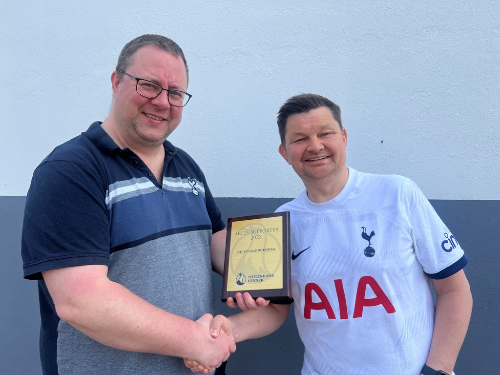 Prisen ble overlevert av leder i Tottenhams Venner, Bjørnar Valen, før kampen mot Burnley lørdag 11. mai.
